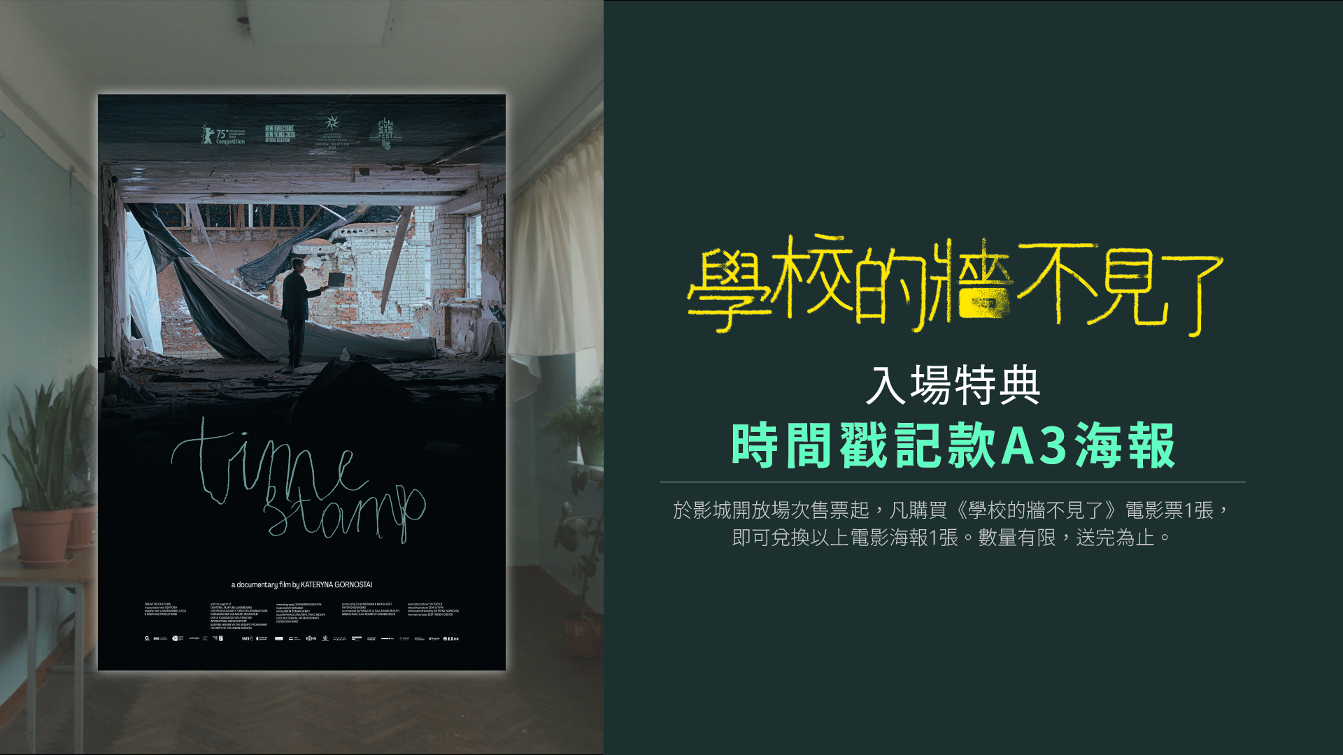 凡購買《學校的牆不見了》3/27起 場次電影票乙張,贈送「時間戳記款A3海報」 乙份。