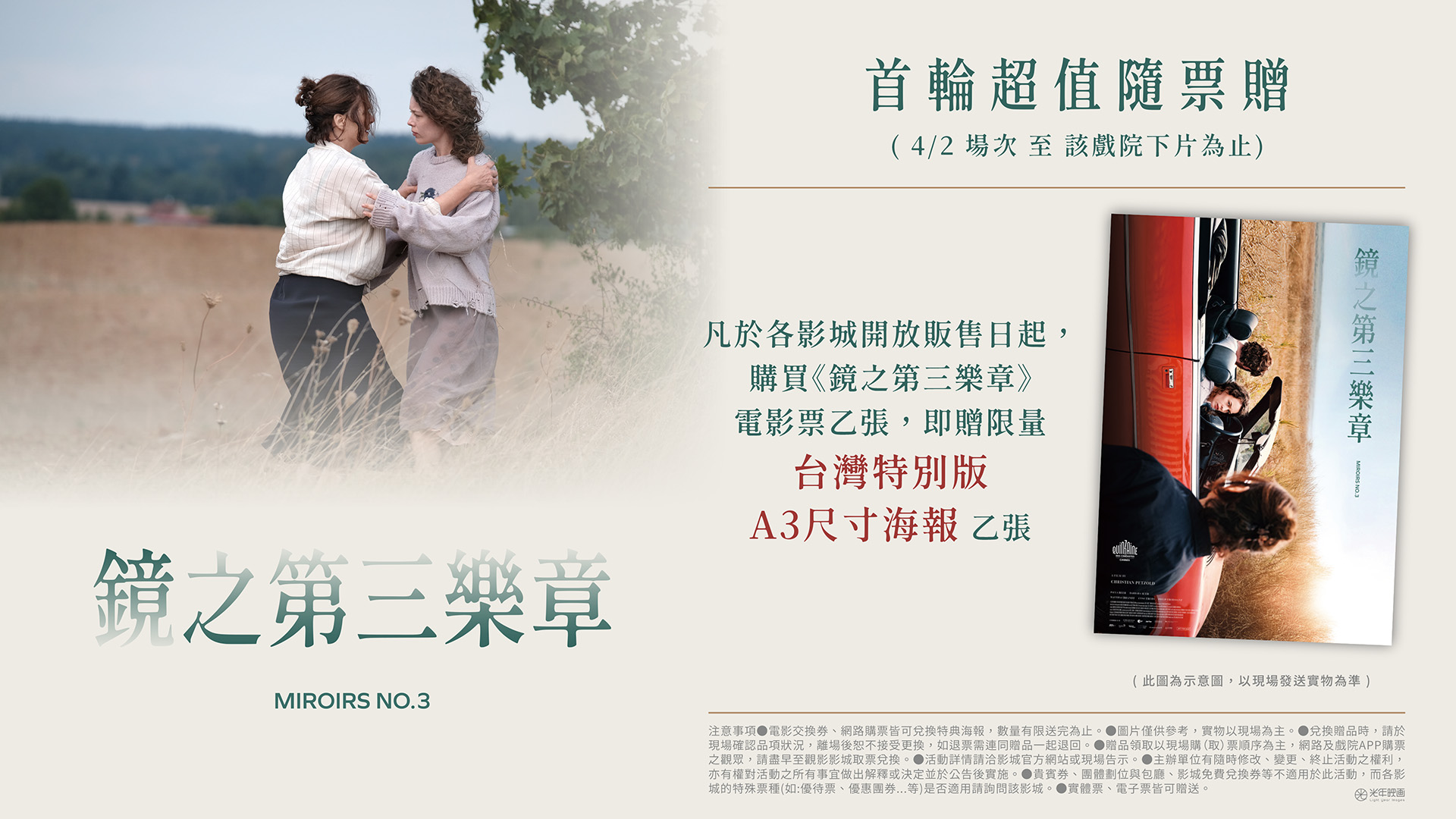 凡購買《鏡之第三樂章》4/2 起 場次電影票乙張,即贈「台灣獨家特別版A3尺寸海報」乙份。