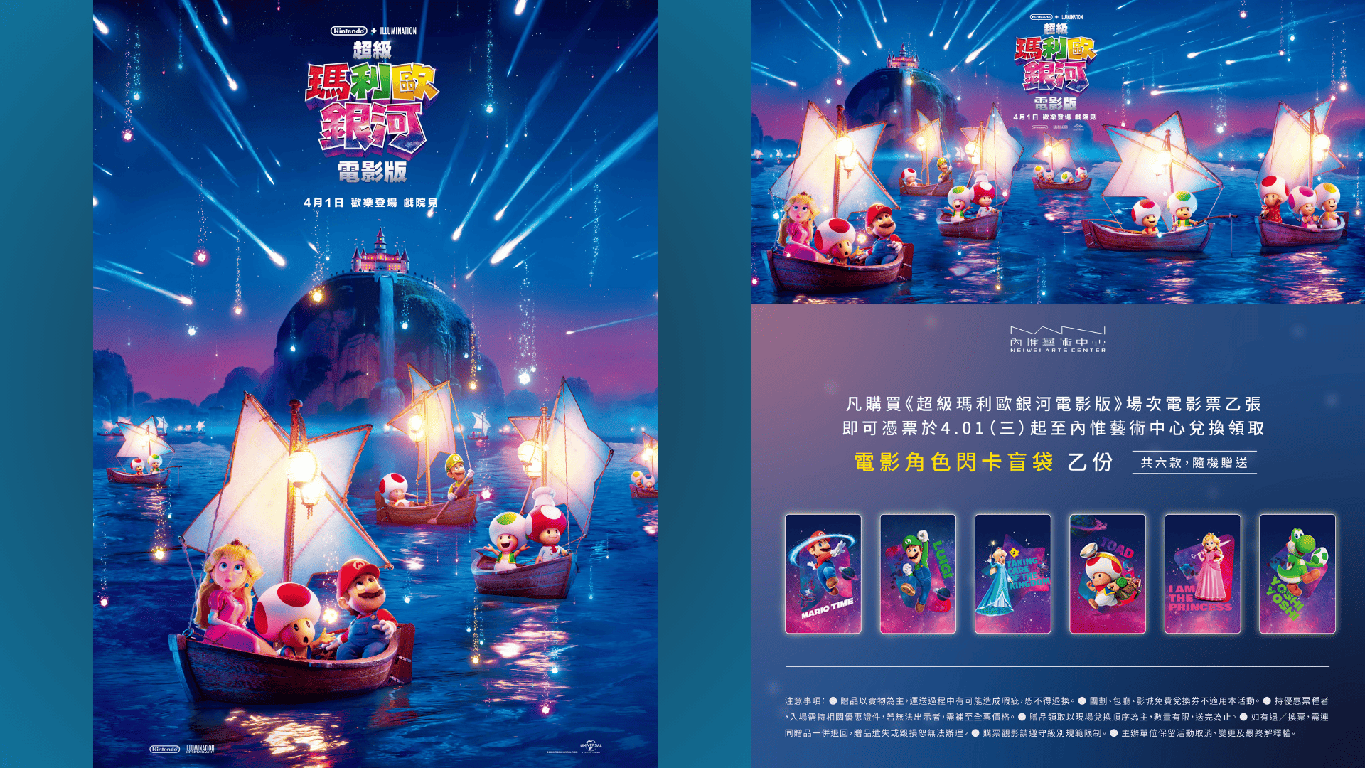 凡購買《超級瑪利歐銀河電影版》4/1 起 場次電影票乙張,即贈「電影角色閃卡盲袋」乙份。
