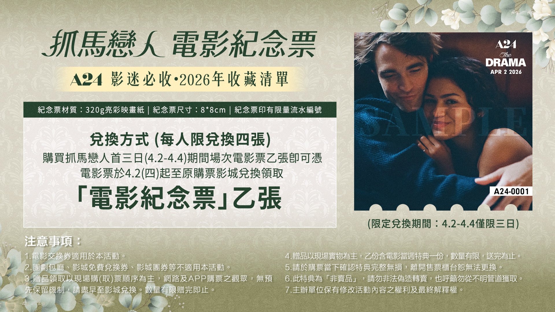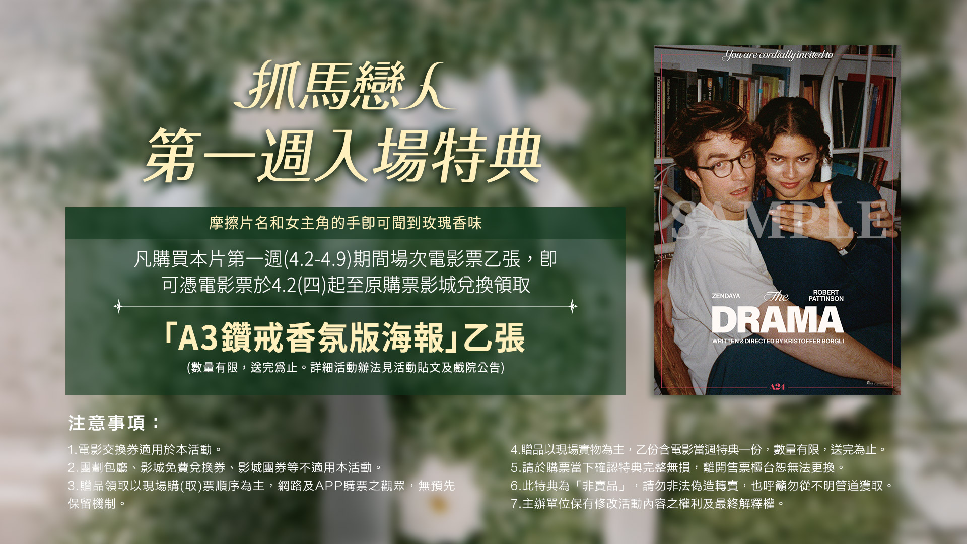 凡購買《抓馬戀人》4/2-4/9 場次電影票乙張,即贈「A3鑽戒香氛版海報」 乙份。