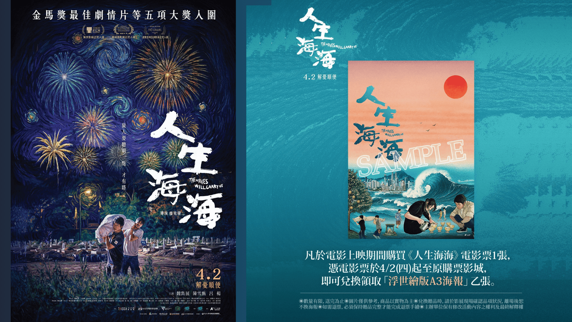 凡購買《人生海海》場次電影票乙張,贈送「浮世繪版A3簽名海報」 乙份。