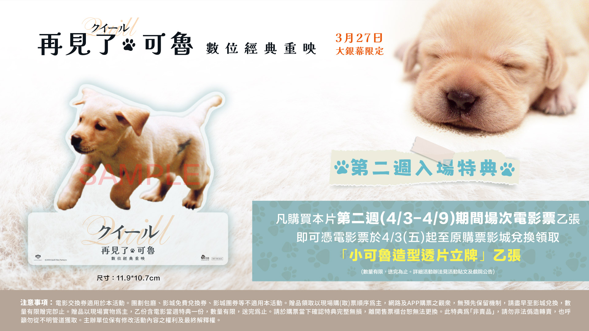 凡購買《再見了,可魯:數位經典重映》4/3-4/9 場次電影票乙張,即贈「小可魯造型透明片立牌」乙份。