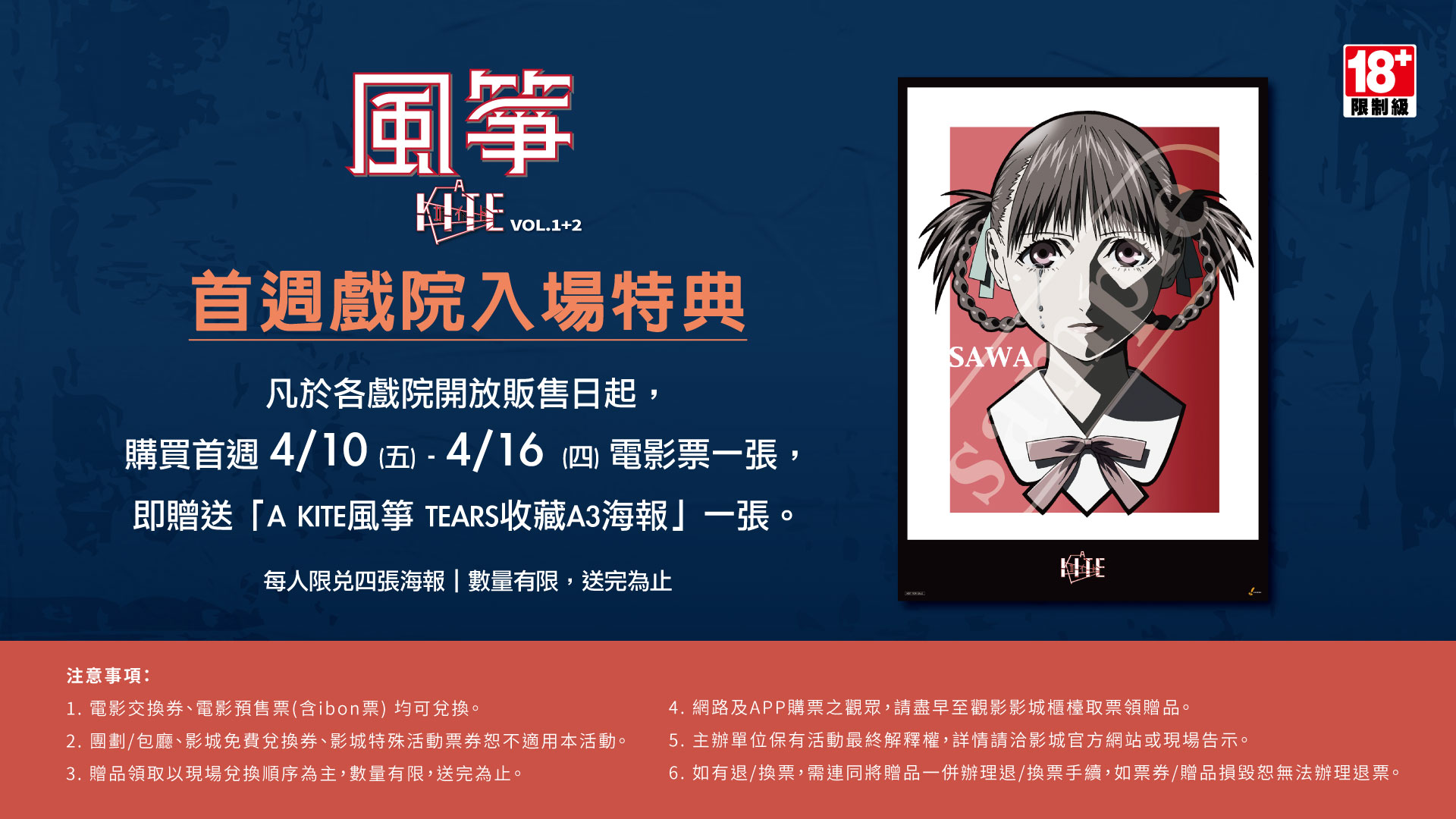 凡購買《A KITE風箏》4/10-4/16 場次電影票乙張,贈送「A KITE風箏 TEARS收藏A3海報」 乙份。