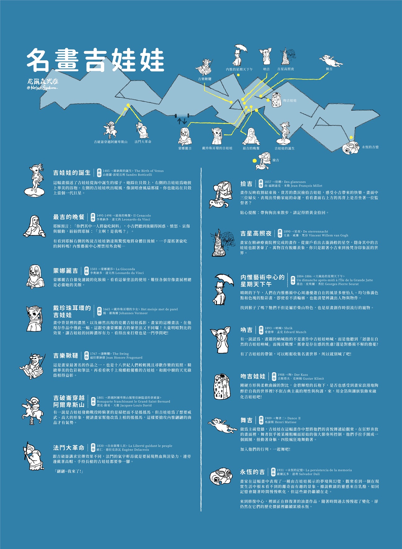 從宏大的曠世鉅作,到反映現實的政治畫,戰爭下貧瘠土地的關懷,再到現代風格的展現,西洋繪畫史龐雜而精深,做不了懶人包,就用可愛主義來包裝。