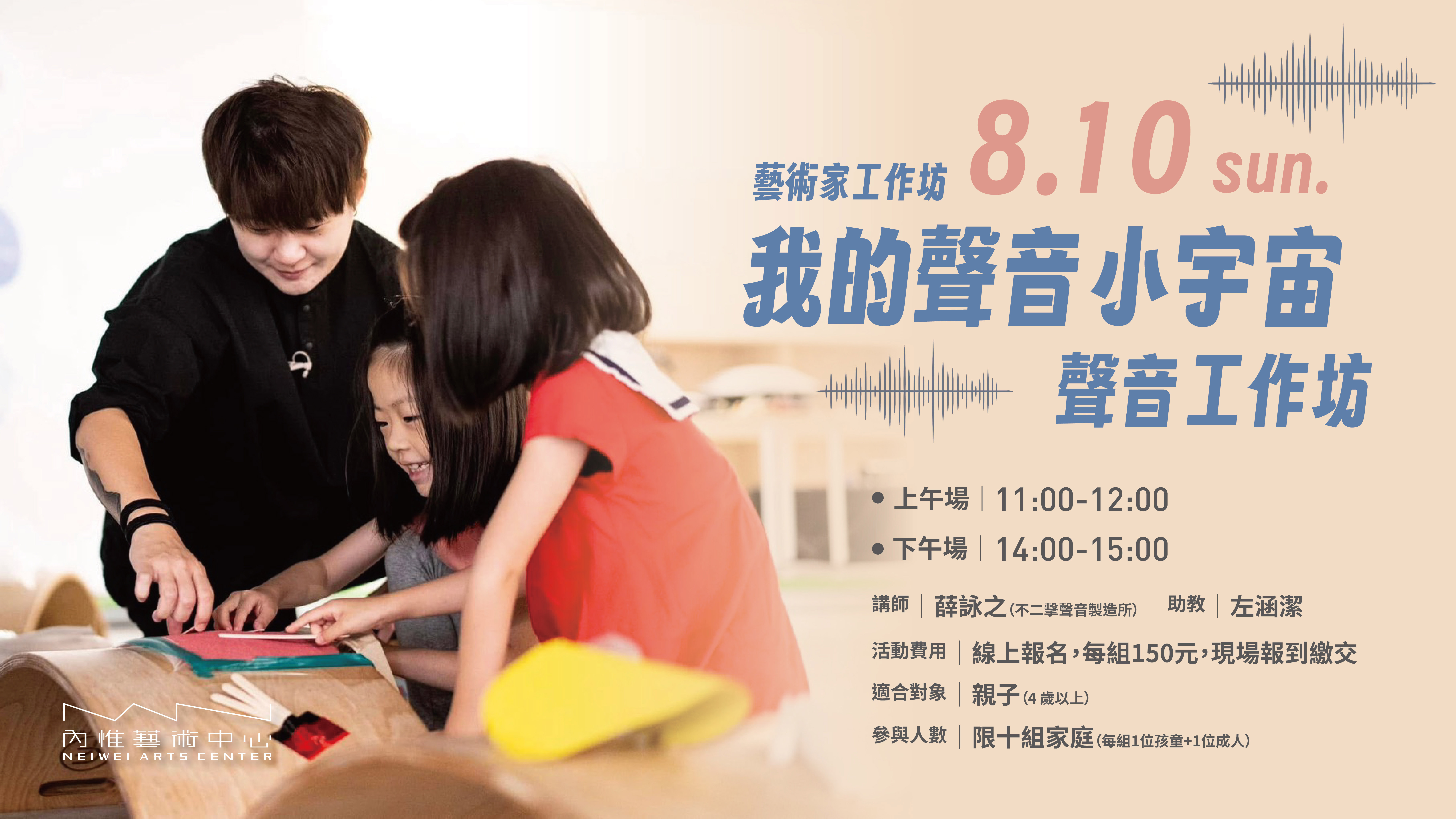 由擅長以聲音與擊樂進行創作的不二擊聲音製造所帶領,邀請對聲音充滿好奇的你,一起進入聲音的宇宙,透過聆聽、遊戲與身體感知,創造出屬於自己的聲音小品。這是一場輕鬆又充滿創造力的聲音旅程,適合親子共同參與,在彼此的聲音裡找到陪伴與連結。