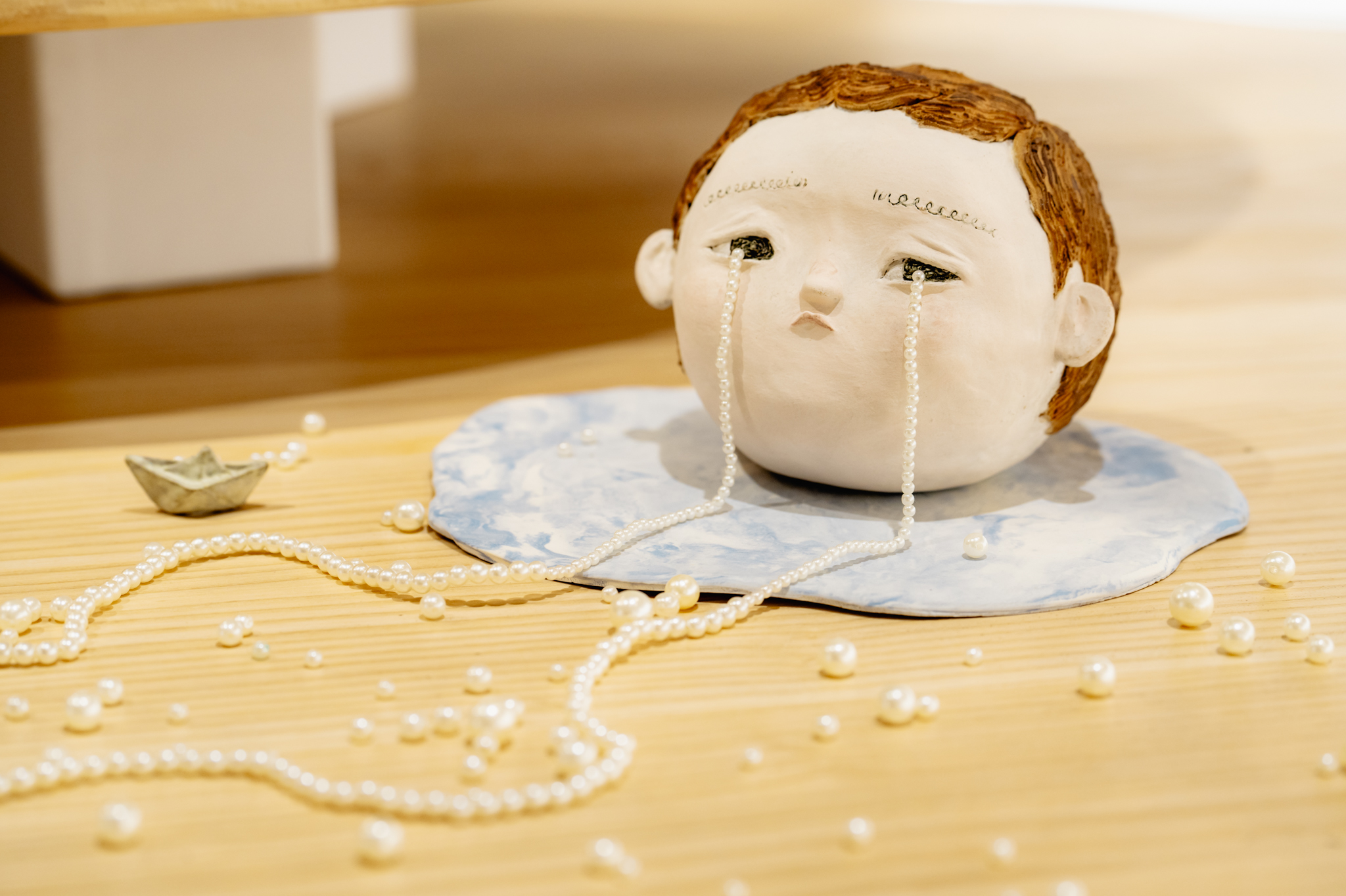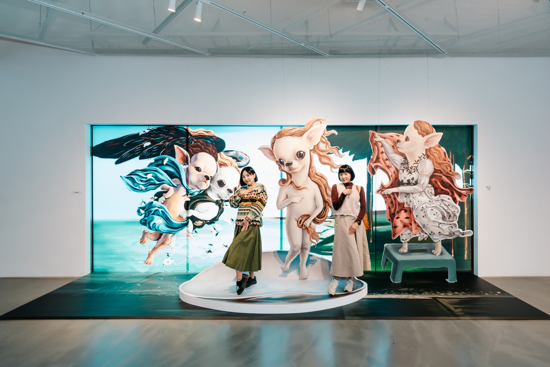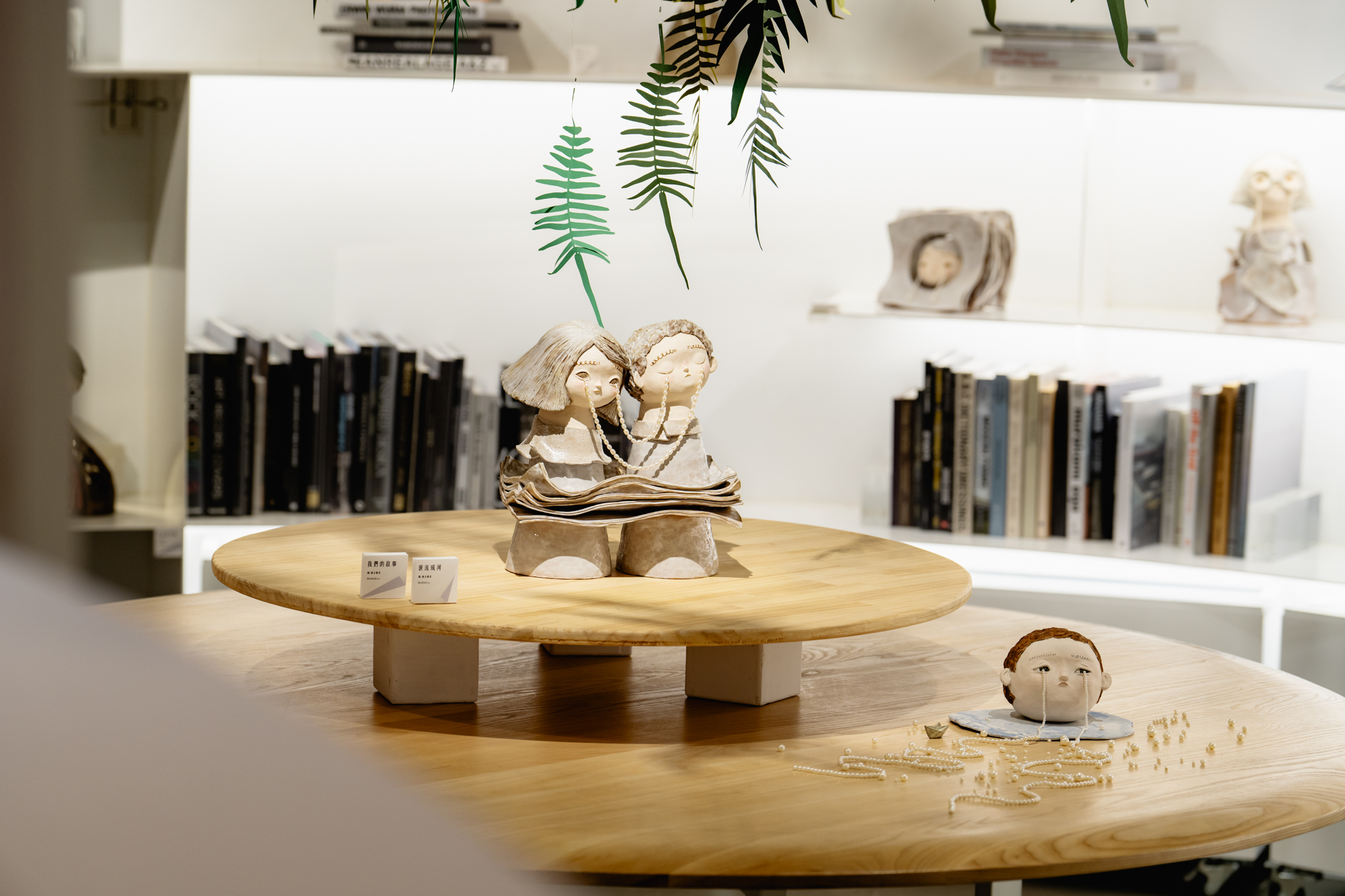 高雄市立美術館代理館長林羿妏表示,《名畫吉娃娃》創作者插畫家「尼爾森氏症」以迷因常客吉娃娃化身世界名畫主角,傳遞簡單的快樂。搭配狗屋的概念,讓作品隱身在內惟藝術中心的各角落,一次收集14個角色的同時,也完整探索場館內外空間。林羿妏表示,以書頁意象將「內惟閱讀」的詩意串入粒粒珍珠,藝術家「不討喜」帶來她以療癒聞名的《眼淚是珍珠》系列,〈Reading,Writing,and Crying〉用10件全新創作、共計15件陶藝作品,呈現出內惟藝術中心內斂溫暖的特質,準備迎接春節返鄉的遊子和各地來到內惟藝術中心的貴客。