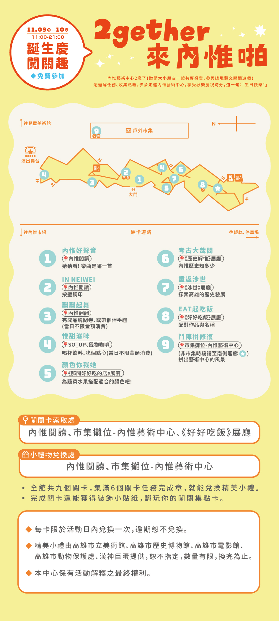 內惟藝術中心為了讓大家更加認識這座2歲的場館,在11/9、10內惟藝術中心2週年慶的時間,在館內安排了9個小小的關卡!只要索取闖關卡完成6關,就可以兌換我們準備的小禮物喔!