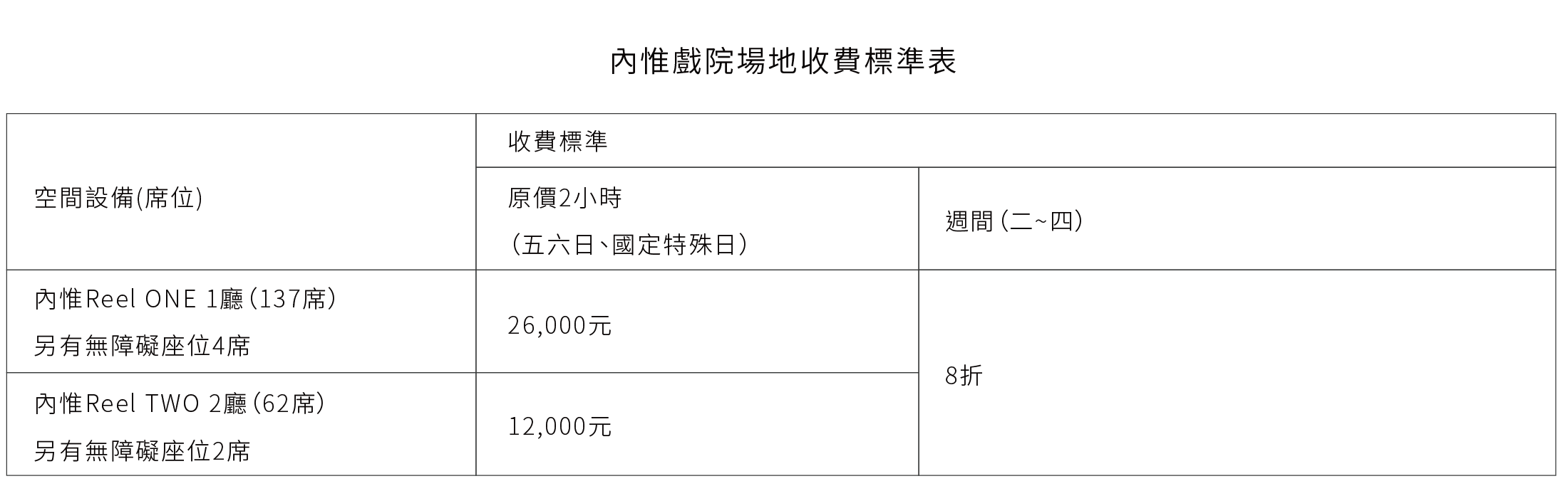 *各區使用範圍請參閱電影館、內惟藝術中心官網場地圖。首次申請使用者,建議於申請前親自至現場確認實際使用範圍、使用方式與場地相關細節(如尺寸、設備、動線等)。