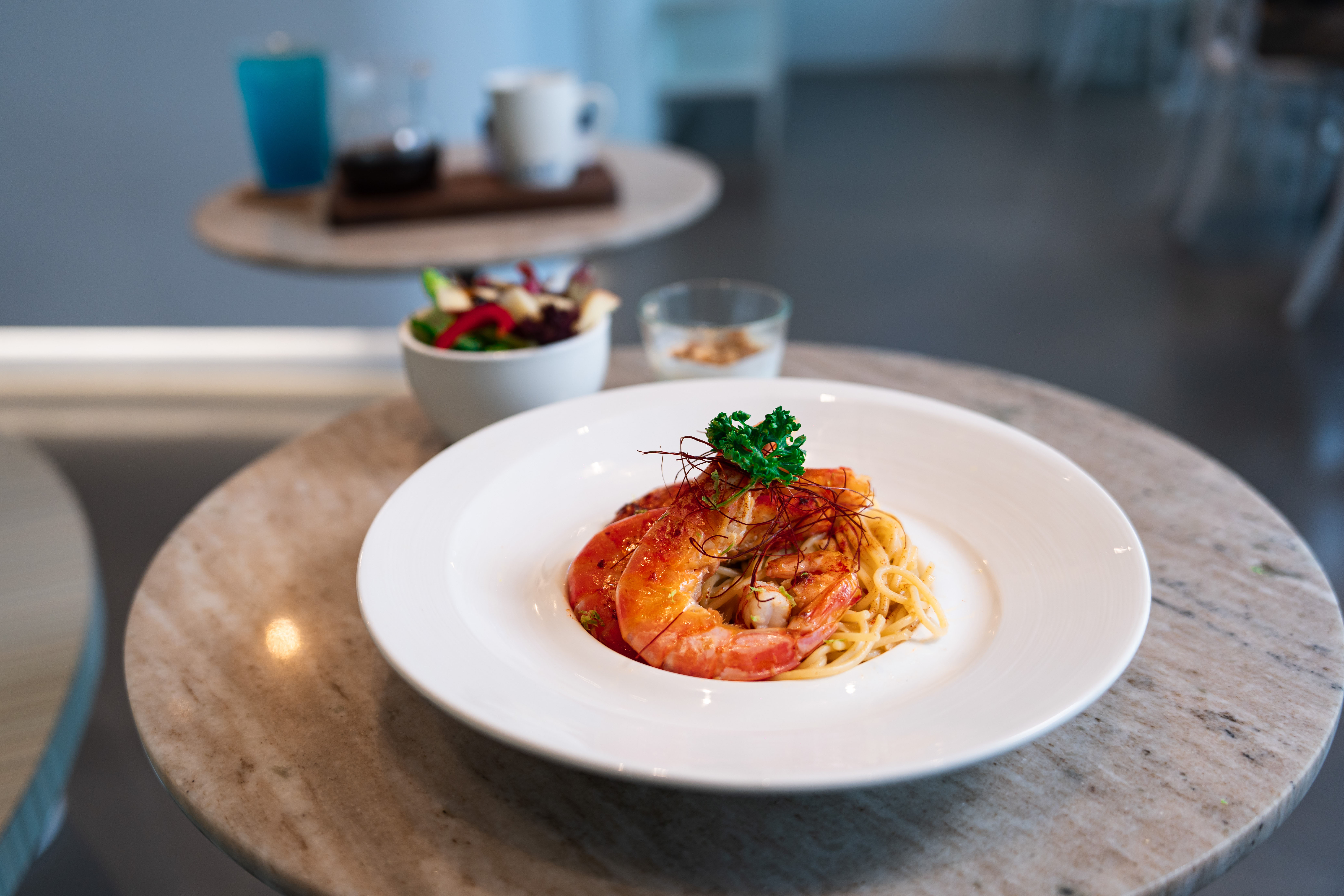 ╰大蝦搭配金黃酥蒜、黑胡椒鹽與清新檸檬皮,層次鮮明,海味與辛香交融,口感彈牙不油膩!